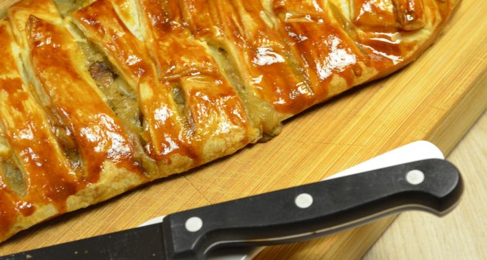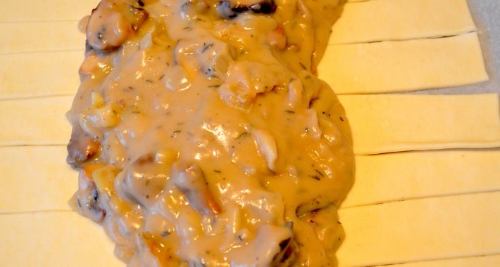 Verdeel de ragout over het midden van het bladerdeeg. Vouw de reepjes om en om naar binnen. Klap de uiteindes van het bladerdeeg dubbel, zodat de vulling er niet uitloopt.