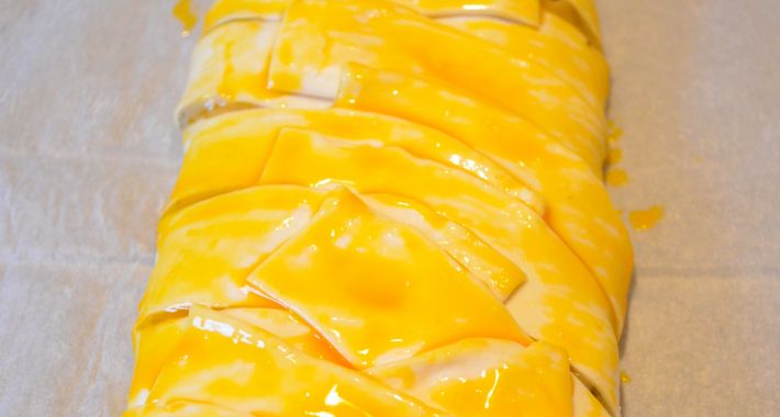 Bestrijk de strüdel met het eigeel en bak deze in ongeveer 30 minuten af.